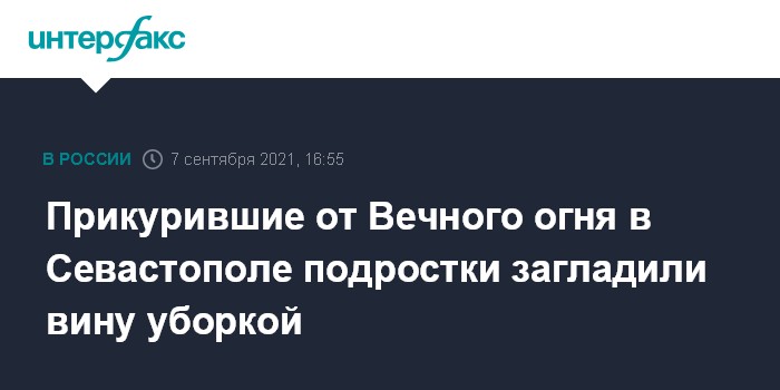 Москва. 7 сентября. INTERFAX.RU - Следователи намерены прекратить уголовное преследование троих несовершеннолетних жителей Севастополя, которые зажгли сигареты от Вечного огня у памятника погибшим в годы Гражданской войны и сняли это на видео.