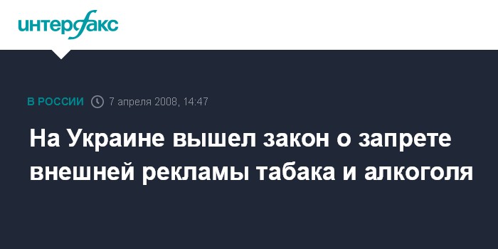 Киев. 7 апреля. INTERFAX.RU - Президент Украины Виктор Ющенко подписал закон, запрещающий внешнюю рекламу табачных изделий, алкогольных и слабоалкогольных напитков.