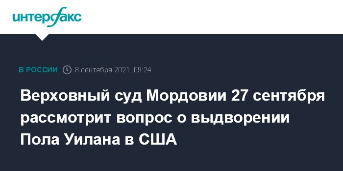 Москва. 8 сентября. INTERFAX.RU - Верховный суд Мордовии назначил на конец сентября рассмотрение ходатайства о выдворении осужденного за шпионаж в РФ американца Пола Уилана в США для отбытия наказания.