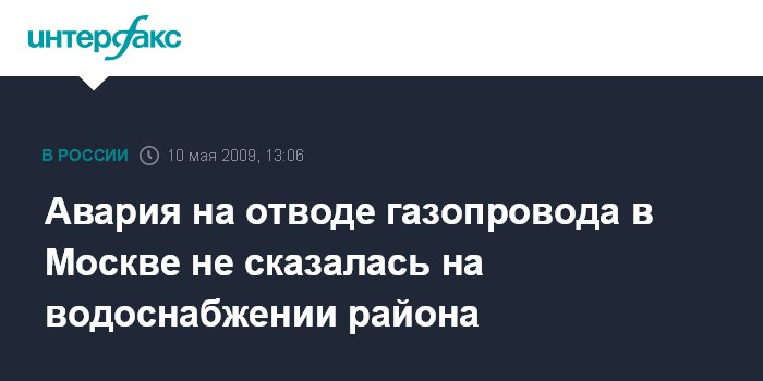 Москва. 10 мая. INTERFAX.RU - Водоснабжение района, где в ночь на воскресенье произошла авария на отводе распределительного газопровода, а также окрестностей остается стабильным, сообщил "Интерфаксу" руководитель "Мосводоканала" Станислав Храменков.