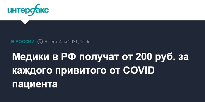 27 августа правительство РФ выделило дополнительные 7,8 млрд рублей на стимулирующие выплаты и компенсации неиспользованных отпусков медицинским работникам, участвующим в вакцинации от коронавируса.