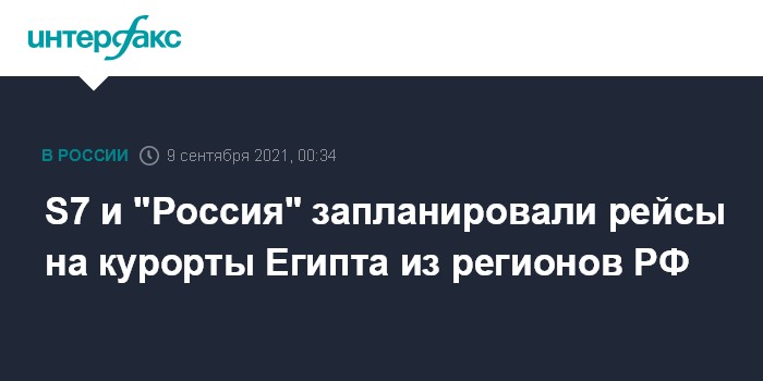 Москва. 9 сентября. INTERFAX.RU - Авиакомпании S7 и "Россия" (входит в группу "Аэрофлот") запланировали запуск регулярных рейсов на курорты Египта из регионов РФ.