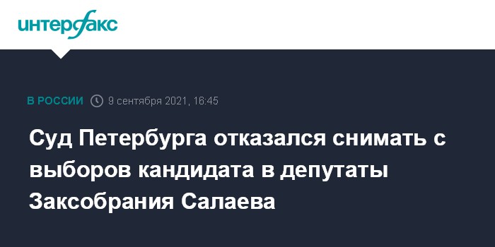 Москва. 9 сентября. INTERFAX.RU - Санкт-Петербургский городской суд отказался отменить решение территориальной избирательной комиссии о регистрации кандидата в депутаты местного парламента Александра Салаева, сообщает в четверг объединенная пресс-служба судов города.