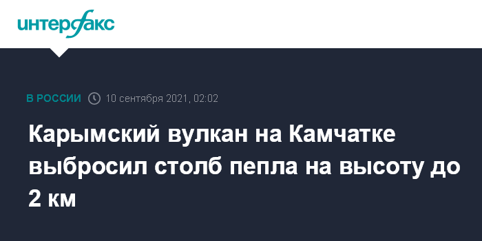 Москва. 10 сентября. INTERFAX.RU - Вулкан Карымский на Камчатке утром в пятницу выбросил столб пепла на высоту до 2 км, сообщает пресс-служба Главного управления МЧС региона со ссылкой на Камчатскую группу реагирования на вулканические извержения (KVERT).