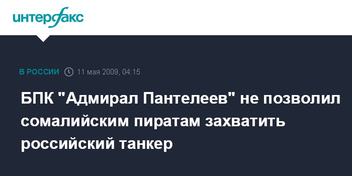 Москва. 11 мая. ИНТЕРФАКС - Корабль Тихоокеанского флота "Адмирал Пантелеев" в Аденском заливе помог российскому танкеру отбиться от сомалийских пиратов.