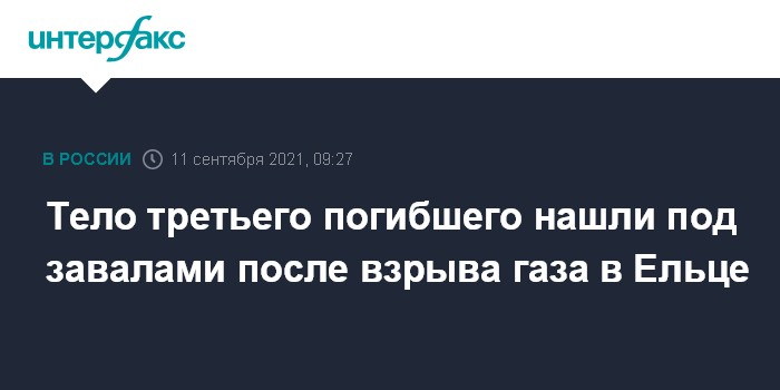 Москва. 11 сентября. INTERFAX.RU - Еще один погибший извлечен из-под завалов дома в Ельце, где взорвался газ, сообщили "Интерфаксу" в администрации Елецкого района. Третьим погибшим оказался пожилой человек, сказал собеседник агентства.