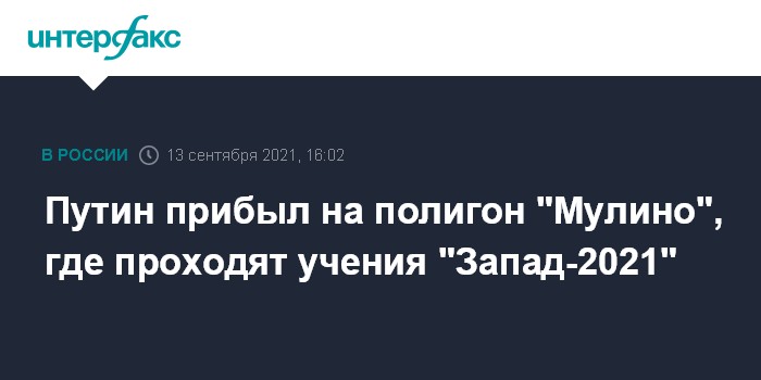 Москва. 13 сентября. INTERFAX.RU - Президент России Владимир Путин прибыл в понедельник на полигон "Мулино" (Нижегородская область), где будет наблюдать за основным этапом российско-белорусских учений "Запад-2021".