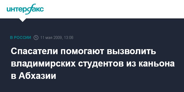 Москва. 11 мая. INTERFAX.RU - Спасатели помогают владимирским студентам, сплавляющимся по абхазской реке, выбраться из каньона в Абахзии, сообщили в Управлении информации МЧС России.