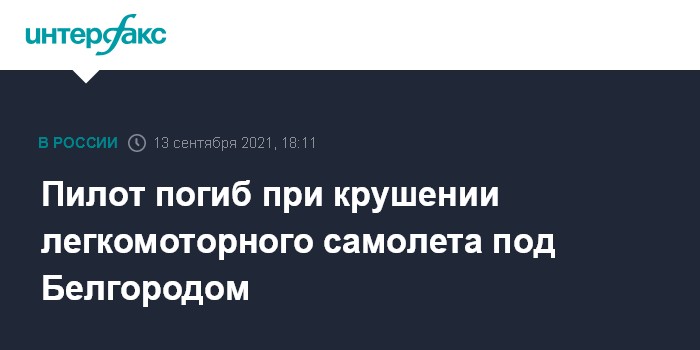 "В Белгородской области между поселками Бехтеевка и Соколовка легкомоторный самолет потерпел крушение во время взлета. На борту был один пилот, он погиб", - сказал собеседник агентства.
