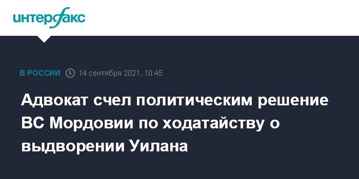 "Суд Мордовии принял больше политическое решение, фактически отказав в рассмотрении нашего ходатайства. Суд мог запросить позиции ведомств в рамках рассмотрения дела и контролировать этот процесс. Сейчас же не понятно, кто будет в итоге принимать решение по нашему ходатайству. Конечно, мы будем обжаловать это решение в апелляционном суде", - сказал "Интерфаксу" адвокат Уилана Владимир Жеребенков.