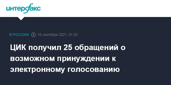 Москва. 15 сентября. INTERFAX.RU - Центризбирком РФ получил 25 обращений от граждан о возможном принуждении к дистанционному электронному голосованию на предстоящих парламентских выборах, сообщила председатель ЦИК Элла Памфилова.