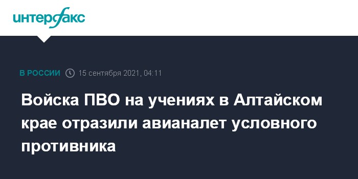 Москва. 15 сентября. INTERFAX.RU - Подразделения противовоздушной обороны общевойскового объединения Центрального военного округа, дислоцированные в Алтайском крае, в ходе учения отразили массированный авиационный налет на военные объекты, сообщает пресс-служба округа.