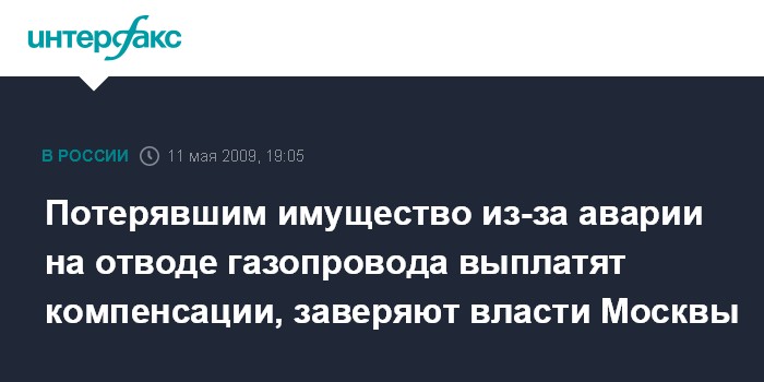 Москва. 11 мая. INTERFAX.RU - Лица, потерявшие свое имущество в результате аварии на отводе распределительного газопровода, получат компенсации, заявил в понедельник журналистам первый заместитель мэра в правительстве столицы Петр Бирюков, находясь на месте аварии.