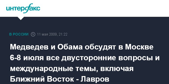 Медведев и Обама обсудят в Москве 6-8 июля все двусторонние вопросы и международные темы, включая Ближний Восток - Лавров