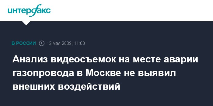Москва. 12 мая. INTERFAX.RU - Анализ видеосъемок, сделанных на месте аварии газопровода на западе Москвы, не выявил никаких следов внешнего воздействия, заявил "Интерфаксу" во вторник источник в силовых структурах, имеющих отношение к расследованию происшествия.