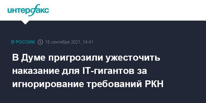 Москва. 15 сентября. INTERFAX.RU - В случае продолжения игнорирования IT гигантами, в том числе Google, предписаний Роскомнадзора Госдума нового созыва примет жесткие поправки в законодательство об ответственности компаний-нарушителей и их российских менеджеров, заявил председатель комиссии Госдумы по расследованию фактов вмешательства иностранных государств во внутренние дела России Василий Пискарев.