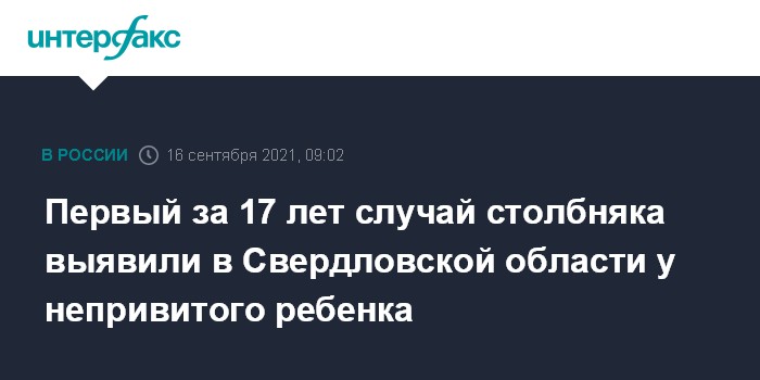 "В Свердловской области зарегистрирован первый за последние 17 лет случай столбняка. Ребенок был не привит, так как родители отказались от проведения вакцинации по идеологическим соображениям. Заболевший находился на лечении в стационаре несколько месяцев, в том числе в отделении интенсивной терапии на аппарате ИВЛ, в медикаментозной коме", - говорится в сообщении.