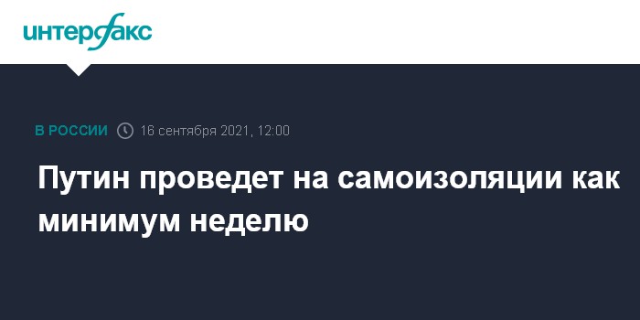 Москва. 16 сентября. INTERFAX.RU - Президент России Владимир Путин проведет в режиме самоизоляции как минимум неделю из-за случаев заболевания коронавирусом в его окружении, сообщил пресс-секретарь главы государства Дмитрий Песков.