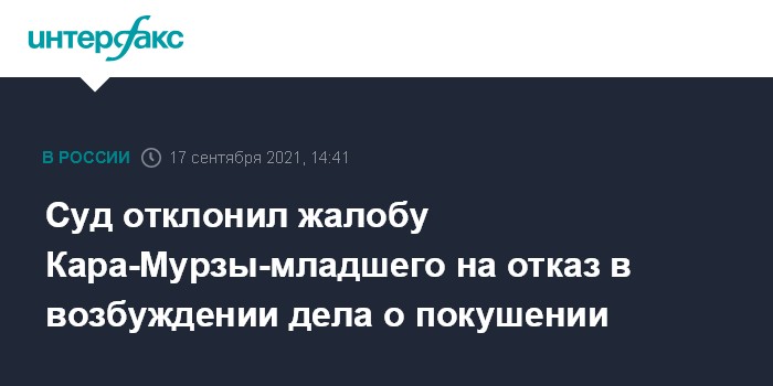 Москва. 17 сентября. INTERFAX.RU - Хамовнический суд Москвы отказал в удовлетворении жалобы общественного деятеля Владимира Кара-Мурзы, просившего признать незаконным решение Следственного комитета не возбуждать уголовное дело о покушении на его убийство.