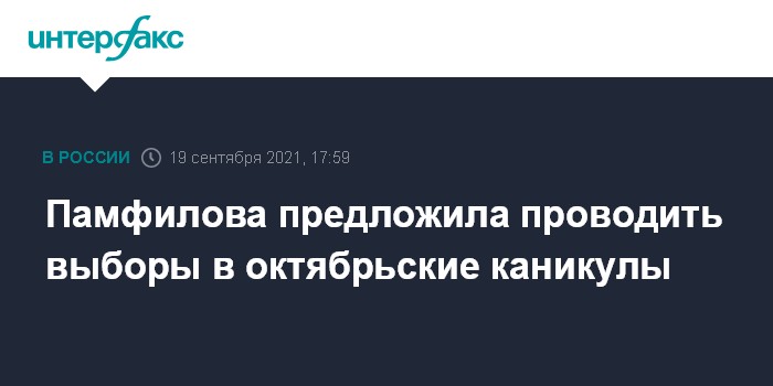 Москва. 19 сентября. INTERFAX.RU - Единый день голосования следует перенести на время школьных каникул в октябре, заявила председатель ЦИК РФ Элла Памфилова.