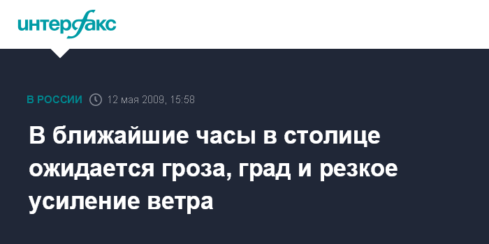 Москва. 12 мая. INTERFAX.RU - Столичные синоптики предупреждают, что в ближайшие часы в столице ожидается резкое ухудшение погоды. "До 22:00 в Москве ожидаются усиление ветра с порывами 10 м/с и выше, местами гроза и град", - сообщили "Интерфаксу" во вторник в Гидрометеобюро Москвы и Московской области.