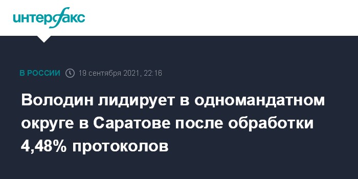 Москва. 19 сентября. INTERFAX.RU - Действующий председатель Государственной думы Вячеслав Володин по итогам обработки 4,48% протоколов набирает 76,32% голосов по Саратовскому одномандатному округу №163, свидетельствуют данные на табло Центризбиркома РФ.