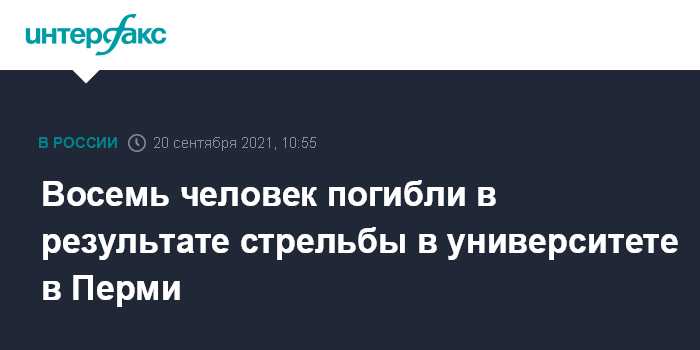Москва. 20 сентября. INTERFAX.RU - Восемь человек погибли при вооруженном нападении на пермский университет, сообщили в Следственном комитете (СК).