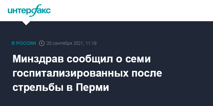 Москва. 20 сентября. INTERFAX.RU - Семь пострадавших в результате вооруженного нападения на Пермский госуниверситет (ПГНИУ) доставлены в местные медучреждения, один из них находится в тяжелом состоянии, сообщает в понедельник Минздрав РФ.