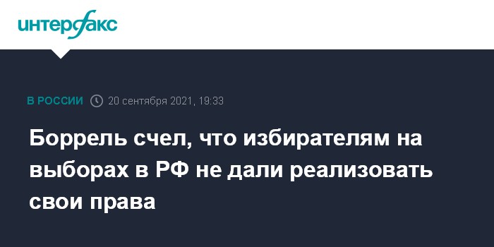 Москва. 20 сентября. INTERFAX.RU - Действия властей РФ против оппозиции привели к тому, что на прошедших выборах не был представлен весь спектр политических сил, за которые могли бы проголосовать российские граждане, говорится в заявлении главы дипломатии ЕС Жозепа Борреля.