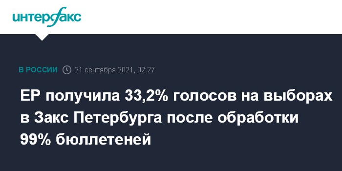 Москва. 21 сентября. INTERFAX.RU - "Единая Россия" получила 33,2% голосов на выборах в петербургский парламент по единому округу по итогам обработки порядка 99% бюллетеней, свидетельствуют данные портала ГАС "Выборы".