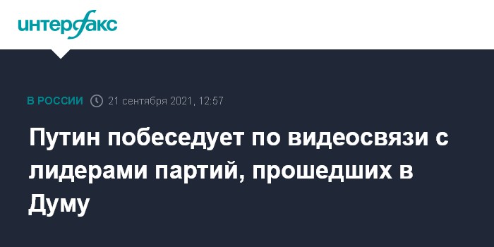 Москва. 21 сентября. INTERFAX.RU - Президент Владимир Путин до конца недели по видеосвязи пообщается с руководством партий, которые прошли в Госдуму по итогам выборов, и сможет поздравить единороссов с победой, заявил его пресс-секретарь Дмитрий Песков.