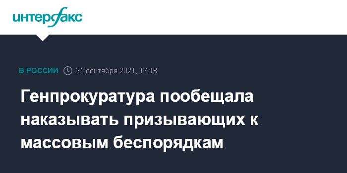 Москва. 21 сентября. INTERFAX.RU - В Генеральной прокуратуре России заявили, что будут привлекать к уголовной и административной ответственности тех, кто призывает к массовым беспорядкам и размещает в интернете заведомо недостоверные сведения, в том числе связанные с прошедшими выборами.