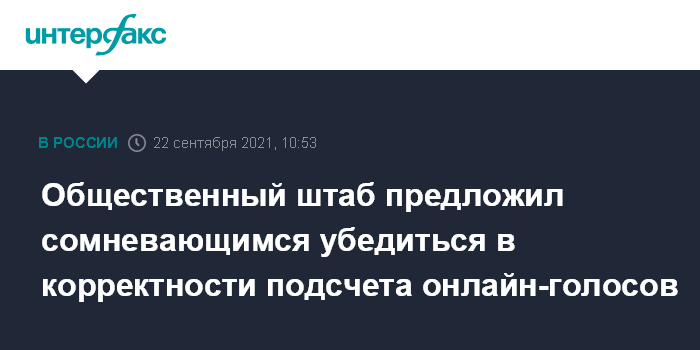 Москва. 22 сентября. INTERFAX.RU - Общественный штаб по наблюдению за выборами предложил сомневающимся убедиться в корректности подсчета голосов, полученных от избирателей столицы в ходе электронного голосования. Об этом в своем телеграм-канале сообщил руководитель штаба, зампред общественной палаты Москвы Алексей Венедиктов.