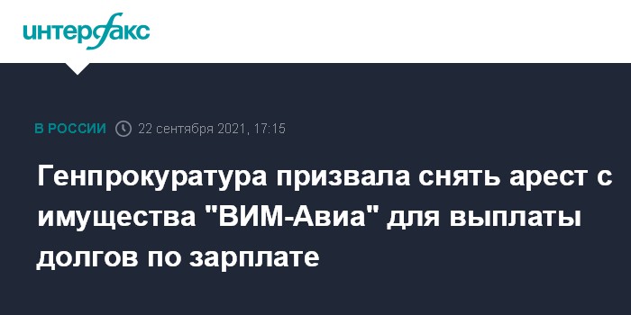 Москва. 22 сентября. INTERFAX.RU - Генеральная прокуратура России считает, что СК РФ должен снять арест с имущества "ВИМ-Авиа" для погашения задолженности по зарплате перед работниками этой авиакомпании-банкрота почти на 300 млн рублей.