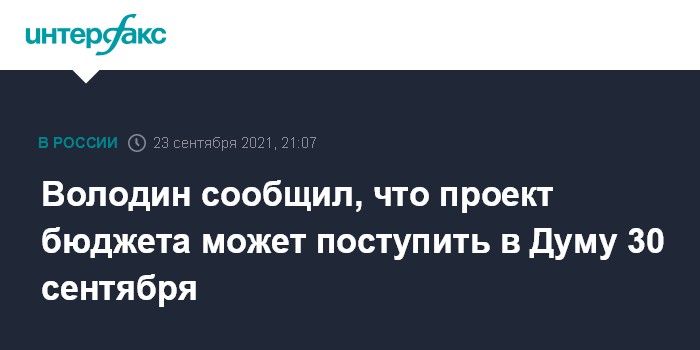 Москва. 23 сентября. INTERFAX.RU - Законопроект о бюджете, как ожидается, поступит в Госдуму 30 сентября, заявил спикер Госдумы Вячеслав Володин.