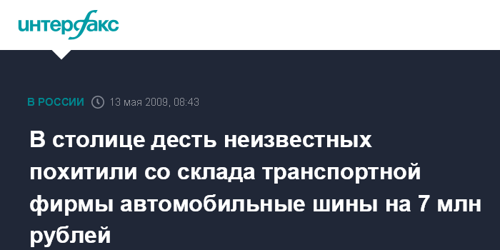 "Десять неизвестных граждан в масках проникли на территорию склада транспортного предприятия "Транс-Авто", угрожая пистолетами, связали троих грузчиков - уроженцев Таджикистана, и похитили шины и диски к большегрузным автомобилям на общую сумму 7 млн рублей", - сообщил "Интерфаксу" источник в правоохранительных органах.