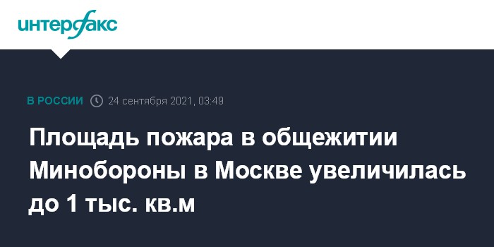 Москва. 24 сентября. INTERFAX.RU - Площадь пожара в общежитии военного университета в Москве увеличилась до 1 тыс. кв. м., сообщил "Интерфаксу" информированный источник.