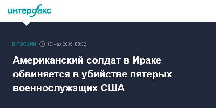 Москва. 13 мая. INTERFAX.RU - Военнослужащему войск США предъявили обвинение в убийствах через день после того, как пятеро его товарищей были найдены погибшими в одном из военных госпиталей Ирака, сообщает во вторник американская телекомпания Си-Эн-Эн со ссылкой на военное командование США в Ираке.