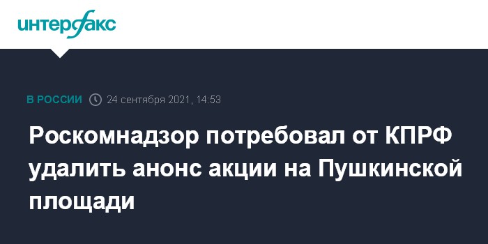 Москва. 24 сентября. INTERFAX.RU - Роскомнадзор потребовал от редакции сайта ЦК КПРФ удалить анонс акции на Пушкинской площади, говорится в сообщении в официальном твиттере КПРФ.