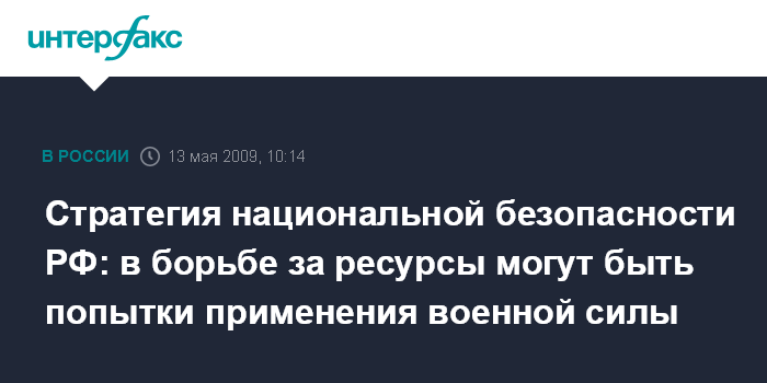Москва. 13 мая. INTERFAX.RU - В условиях борьбы за энергоресурсы не исключены решения возникающих проблем с применением военной силы, говорится в Стратегии национальной безопасности РФ до 2020 года.