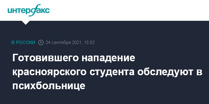 Москва. 24 сентября. INTERFAX.RU - 18-летний студент Южного аграрного техникума из Краснотуранска, арестованный за подготовку убийств однокурсников, помещен в краевой психоневрологический диспансер для обследования " в связи с наличием признаков психиатрического заболевания", собщили в СКР.