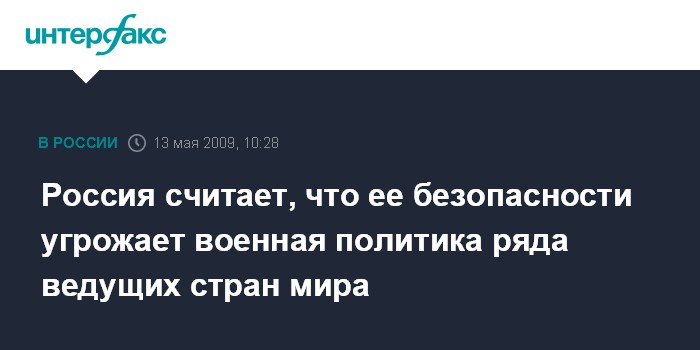 Москва. 13 мая. INTERFAX.RU – Россия рассматривает как угрозу своей безопасности политику ряда ведущих государств, направленную на достижение преобладающего превосходства в военной сфере, говорится в Стратегии национальной безопасности РФ до 2020 года.