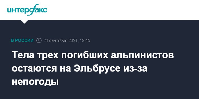Москва. 24 сентября. INTERFAX.RU - Из-за неблагоприятных погодных условий спасатели не смогли спустить с Эльбруса тела трех погибших накануне альпинистов, сообщили в пятницу "Интерфаксу" в Эльбрусском высокогорном поисково-спасательном отряде МЧС России.