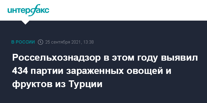 Москва. 25 сентября. INTERFAX.RU - Россельхознадзор опубликовал хронику нарушений при поставках из Турции растительной продукции, указав, что карантинные объекты выявлялись в течение всего года.