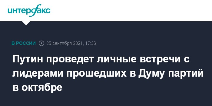 "Такие встречи запланированы в течение октября месяца со всеми руководителями партий индивидуально", - сказал он в субботу в ходе онлайн-встречи главы государства с руководителями партий, прошедших в Госдуму нового созыва.