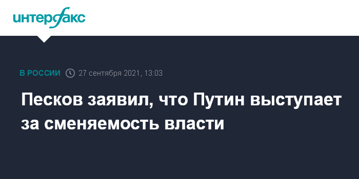 Москва. 27 сентября. INTERFAX.RU - Пресс-секретарь президента России Дмитрий Песков заявил, что глава государства Владимир Путин является сторонником идеи сменяемости власти, но считает необходимым сбалансированный подход в этом вопросе.