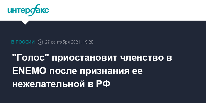 Москва. 27 сентября. INTERFAX.RU - Общероссийское общественное движение в защиту прав избирателей "Голос" (признано НКО-иноагентом) планирует приостановить свое членство в международной неправительственной организации "Европейская сеть организаций по наблюдению за выборами" (ENEMO) после объявления ее нежелательной в РФ.