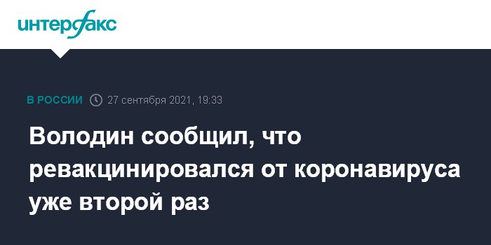 Москва. 27 сентября. INTERFAX.RU - Председатель Госдумы VII созыва Вячеслав Володин сообщил, что привился от коронавируса уже в третий раз.
