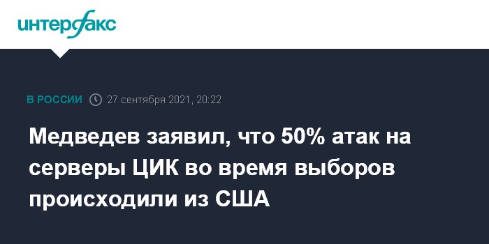 Москва. 27 сентября. INTERFAX.RU - Приблизительно 50% совершенных в ходе выборов в Госдуму на серверы Центризбиркома хакерских атак было из США, заявил заместитель председателя Совета Безопасности РФ Дмитрий Медведев.