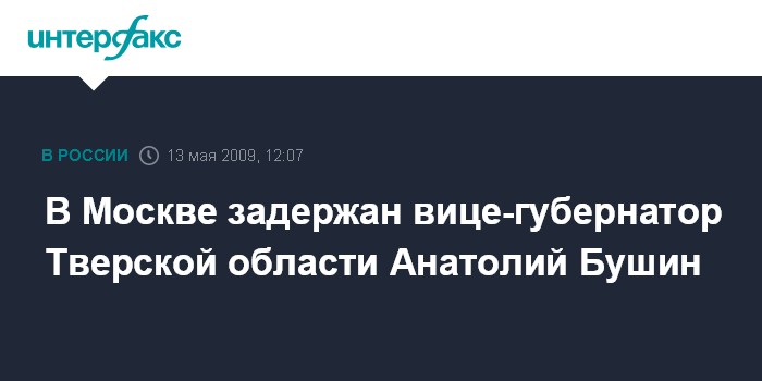 Москва. 13 мая. INTERFAX.RU – В Москве задержан вице-губернатор Тверской области Анатолий Бушин, сообщил "Интерфаксу" источник в правоохранительных органах.